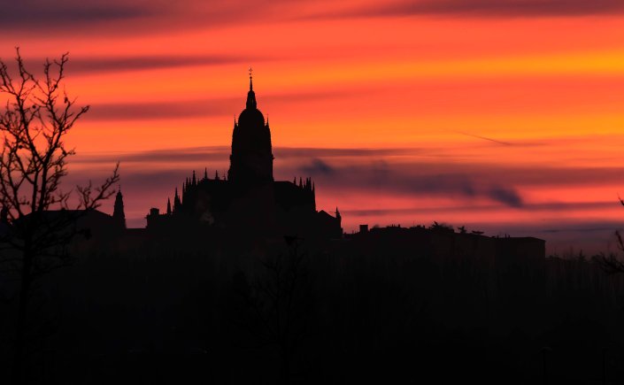 Die Straße führt uns durch weite, noch im Winterschlaf liegende Kornfelder und halb verlassene Dörfer weiter nach Norden. Dann kommen wir nach Salamanca, Großstadt und Hauptstadt der Region Kastilien und León. Mit Blick auf die Altstadt und den Río Tormes finden wir in einem geplanten Neubaugebiet ohne Häuser einen guten und ruhigen Stellplatz. Ein Spazierweg entlang des Fusses und über eine Römische Brücke führt in das Zentrum der geschichtsträchtigen Stadt. Mächtig erhebt sich der Glockenturm der Neuen Kathedrale. Gegenüber ein Gebäude der Universität, die älteste noch bestehende in Spanien. Der Stadtpalast ist geschmückt mit 300 Jakobsmuscheln, als Symbol der Santiago-Pilgerschaft. Das Schmuckstück ist die prächtige Plaza Mayor. Einst fanden hier Stierkämpfe statt, bis Philipp V. den Einwohnern wegen ihrer Loyalität 1729 den Platz neu gestalten lies. Die Monumentalität und Pracht erschlägt einen fast, was für Gegensatz zur der ärmlichen Landschaft rundherum. Nach zwei Tagen ziehen wir weiter auf der Suche nach Einsamkeit.